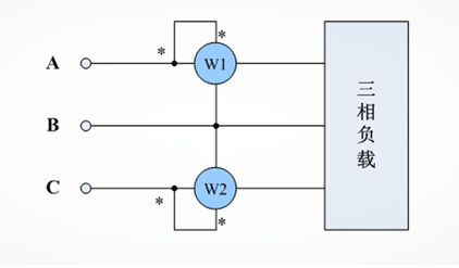 圖1中,單相功率表或三相功率表的某一相W1測量的是P1=UAB*IA*cosφAB,W2測量的是P2=UCB*IC*cosφCB。則三相電路總功率為:P=P1+P2。