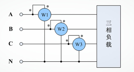 2、 三相四線制,由于無法判斷三相負載是否平衡或是否在中性線上有零序電流產生,只能采用三瓦計法;