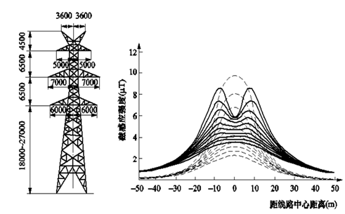 應注意到,線路周圍空間的工頻磁感應強度與線路電流成正比。隨著單回線路輸電容量的增大,500kV同塔多回輸電線路已采用分裂數更多、截面更大的導線(如6×630mm2導線),每回線路電流可高達2000~3000A。此時,線路下方工頻磁感應強度*大值可能高達20~30μT。但即使對多分裂、大截面、走廊內線路高度密集的同塔多回路輸電線路,其下方的工頻磁感應強度*大值仍遠低于環境影響評價標準限值(100μT)。由圖1、圖2計算實例可見,在距線路中心50~100m以上距離處,來自電力線路的工頻磁場水平已與當地生活環境中的背景水平相當。