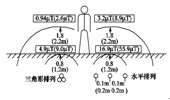 對于三相地下電纜輸配電線路,在其敷設位置上方地面所產生的磁場水平,取決于電纜埋設深度、3條相線之間的距離、導線的相對排列方式以及電纜中的工作電流。將三相3根電纜的間距減小,由于不同相位的三相磁場互相抵消的作用,可明顯降低地面的磁場;采用3芯電纜或將三相單芯電纜布置成三角形也可有效降低地面磁場。圖3-6給出了工作電流為300A的中壓(10~20kV)電纜(圖中括號外數據)和工作電流為600A的高壓(110kV)電纜(圖中帶括號數據)在常規埋設深度下產生的地面工頻磁感應強度數值及分布示意圖。由圖3可見,在直接敷設地下電纜的地面上方路段,工頻磁感應強度可達到10μT數量級,其數值比相應架空線路產生的磁場更高,但其影響范圍相對較小。同樣的分析結論也可見于美國南加州愛迪生電力公司的設計導則中。