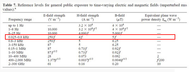 【ICNIRP對公共人群制定的電磁場安全參考水平[1]。50Hz的電磁場應(yīng)參考第四行,其中電場限值為250/f,頻率f=0.05kHz,因此限值為5000V/m;磁場限值為5/f,同理計算可得限值為100μT。)】