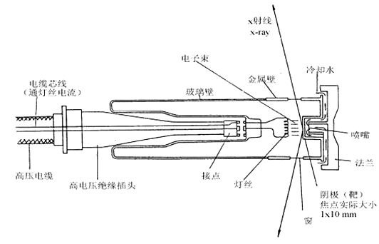 用來產生X射線的裝置是X射線管。它由陰極、陽極和真空玻璃(或金屬陶瓷)外殼組成,其簡單結構和工作原理如圖1所示。陰極通以電流加熱至白熾狀態時,其陽極周圍形成電子云,當在陽極與陰極間施加高壓時,電子加速穿過真空空間,高速運動的電子束集中轟擊陽極靶子的一個面積(幾平方毫米左右、稱實際焦點),電子被阻擋減速和吸收,其部分動能(約1%)轉換為X射線,其余99%以上的能量變成熱能。