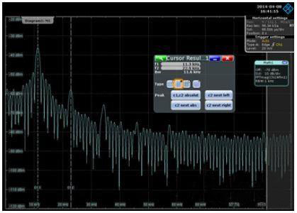 電源噪聲測(cè)量時(shí)不要求較高的采樣率,所以可以設(shè)置很長(zhǎng)的時(shí)基,這也意味著采集的信號(hào)時(shí)間可以足夠長(zhǎng),可以認(rèn)為覆蓋到了整個(gè)有效信號(hào)的時(shí)間跨度,此時(shí)不需要添加窗函數(shù)。調(diào)整以上設(shè)置可以得到比較準(zhǔn)確的FFT變換曲線了,再通過(guò)zoom功能查看感興趣的頻點(diǎn)。如下圖中電源噪聲的主要能量集中在11.3KHz左右,并以該頻率為基波頻率諧振。據(jù)此可以推斷本PDN網(wǎng)絡(luò)在11.3KHz處的阻抗不能滿足要求,電容在該頻點(diǎn)的阻抗也比較高,起不到降低阻抗的作用,所以前面增加電容并不能減小電源噪聲。
