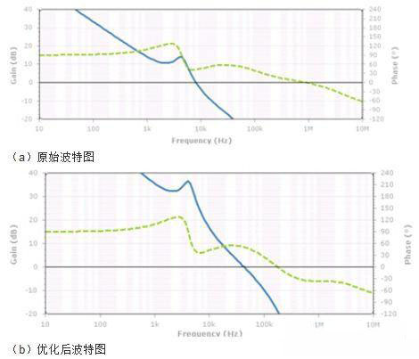 一般來(lái)說(shuō),11.3KHz應(yīng)該是VRM的管轄范圍,此處出現(xiàn)較大噪聲說(shuō)明VRM電路設(shè)計(jì)不能滿足要求。這里對(duì)VRM的性能進(jìn)行分析,VRM分析的方法眾多,此處主要采用仿真其反饋環(huán)路波特圖的手段。波特圖主要觀察幾個(gè)關(guān)鍵信息:1、穿越頻率,增益曲線穿越0dB線的頻率點(diǎn);2、相位裕度,相位曲線在穿越頻率處所對(duì)應(yīng)的相位值;3、增益裕度,相位在-360°時(shí)所對(duì)應(yīng)的增益值。這里我們主要關(guān)注穿越頻率和相位裕度這兩個(gè)指標(biāo)。從VRM的環(huán)路波特圖(如下圖a)可以看到,VRM的穿越頻率在8KHz左右,相位裕度37度。這里存在兩個(gè)問(wèn)題:首先VRM的相位裕度一般需要大于45度才能保證環(huán)路的穩(wěn)定工作,這里相位裕度稍小一些,需要增加相位裕度;其次穿越頻率太低,穿越頻率附近VRM的調(diào)整作用逐漸降低,而此頻點(diǎn)bulk電容還起不到作用,所以在8KHz附近會(huì)存在較高的阻抗,這個(gè)頻點(diǎn)的噪聲抑制作用較差。下圖(b)是優(yōu)化VRM環(huán)路之后的波特圖,調(diào)整相位裕度到50度,穿越頻率推到46KHz左右。