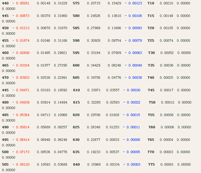 通過這一段分析可以看出,從546.1nm到690nm這一段,b的數量是由0開始增加,之后又減少,到了690nm處的時候減少到0。顯然b在這區間內肯定要有一個*大值。現在,我們來看一下“光譜三刺激值”表中的546.1nm到690nm這一段,其中起輔助作用的光的“藍原色”的數量的變化(即,藍色三刺激值的變化),不*是這樣的一種情形嗎?它有一個*大值*發生在545nm處,數值的大小是0.00138(在表中我們對這個*大值中的138標了黑色,目的為了便于重新查找它。至于這個“刺激值”的負號來源,也*無需再作解釋了)。