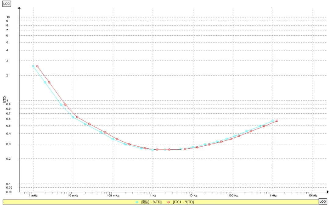 介質譜分析測試的是各個不同頻率下的電容值和介損值,并繪制成電容和介損的頻率曲線。介質譜曲線能夠更為清晰地反映絕緣的狀態,并且有助于判斷測試結果是否存在異常。介損隨頻率改變,從左到右頻率逐次增大。可以看到,測試結果曲線與模型曲線十分平滑且基本一致。模型曲線與測試曲線有偏移的原因是溫度不同。
